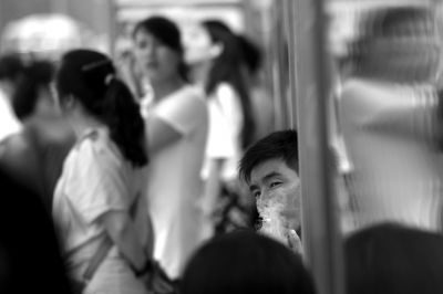 昨天,在三元橋公交站臺,一男子在排隊等車的人群中吸煙,此舉屬于違反《北京 市控制吸煙條例》的行為。 京華時報記者譚青攝