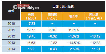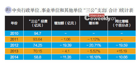 2014年是“八項規定”貫徹執行的第二年,削減勢頭更猛。中央部門“三公”經費支出合計約58.8億元,比2013年實際支出減少11.35億元,僅次于2012年的削減支出。