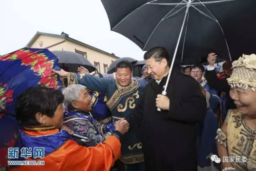 兩個月后,黑龍江八岔赫哲族鄉八岔村雨淅淅瀝瀝下個不停,習近來到烏蘇里江畔親切看望赫哲族群眾。