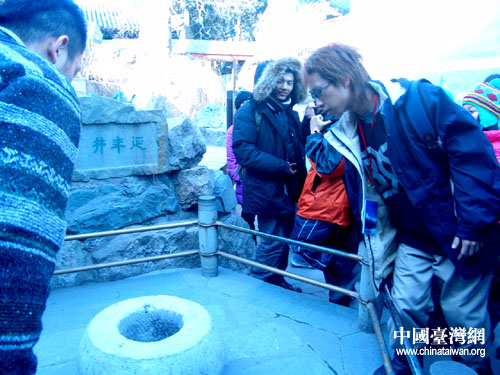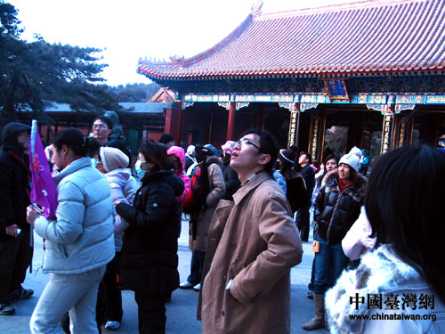 談笑間,一個同學的一聲“好美”把大家的視線都吸引了過去,原來他看到了結(jié)冰的昆明湖,學生們幾乎是用沖的速度奔到了湖邊。導游提醒大家千萬不要下去滑冰,同學們只能在湖邊合影,惹得過往的北京老奶奶值納悶:“湖里什么都沒有,照什么呢?”她哪里知道這些來自臺灣的學生此行就是踏雪尋冰,還要等幾天才能到東北,他們心里的急迫可以理解。