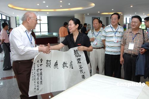 八月八日,臺灣客家文化專家學(xué)者參觀福建龍巖學(xué)院,臺灣中國醫(yī)藥大學(xué)前院長王廷輔(前排左一)參觀龍巖學(xué)院時書贈:“有教無類”。 中新社發(fā) 鄭祚聲 攝