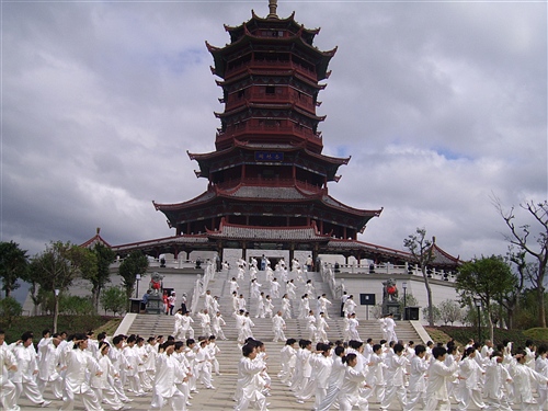 園博會開幕式后 閩臺島主體建筑杏林閣前。玻埃拔焕夏晏珮O拳愛好者表演太極拳