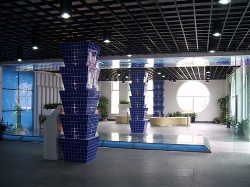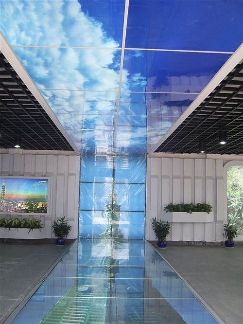 與古色古香的閩南建筑不同,臺灣城市室內展示園區則是另一番景象。臺灣園集中展示了臺北市、臺南市、臺中市、高雄市等的人文風情和迷人景色,但是其表現風格則迥然不同。臺灣園室內以清新的天藍色為主色調,方格子藍色立體柱、VCD風景片介紹、觸摸式電腦查詢機,再加上簡約而不失動感的裝修風格,現代氣息濃厚。特別是以光影營造出的臺北101大樓圖景,更將一個現代時尚之都市展露無遺。