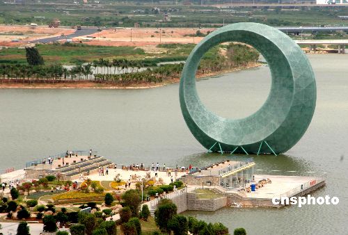 屹立于廈門園博園內湖中央的三十六米高標志性建筑“月光環”寓意“海上升明月,天涯共此時”,表達了兩岸人民共同期盼和平統一的心愿。 中新社發 王東明 攝