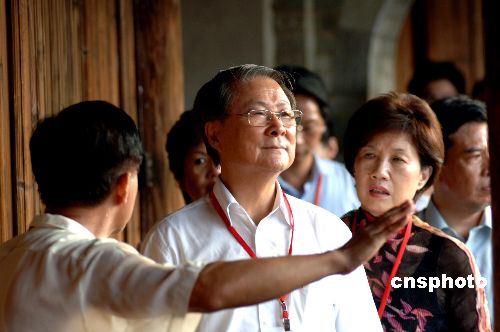 九月二十六日,中國國民黨中評會主席團主席、中華海峽兩岸客家文經(jīng)交流協(xié)會理事長饒穎奇先生(左二)及其夫人饒高淑端女士(左三)在永定參觀客家土樓。當日,一百四十八位臺灣客籍人士經(jīng)由“廈門-金門”航線抵達廈門和平碼頭,隨后由廈門趕往龍巖永定著名土樓——振成樓參觀,開始為期兩天的“客家尋根之旅”。 中新社發(fā) 王東明 攝