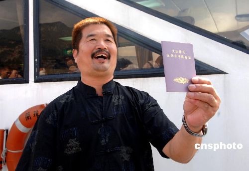 九月二十八日上午,首次前往澎湖旅游的福建游客陳君凡在福州馬尾碼頭展示“大陸居民往來臺灣通行證”。當日,三十七名福建居民首次乘坐“閩珠一號”經由“兩馬”(馬尾—馬祖)航線前往馬祖后,轉機赴澎湖旅游。 中新社發 王東明 攝