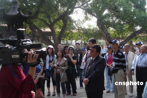 臺灣新同盟會參訪團(tuán)一行三十五人在許歷農(nóng)會長的帶領(lǐng)下,十九日到泉州古城參觀考察,在參觀了中國閩臺緣博物館后,還觀看了具有閩臺特色的民俗表演及木偶表演和南音演唱。圖為參訪團(tuán)一行正在參觀泉州開元寺。 中新社發(fā) 黃瑤瑛 攝