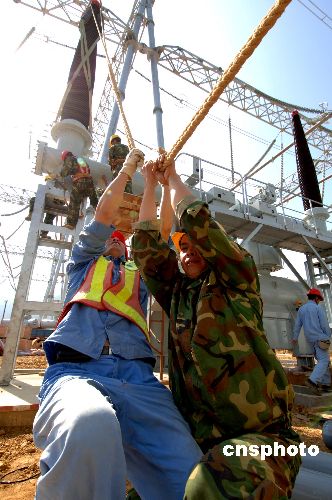 未來五年福建省電力公司將投資544億元人民幣打造海峽西岸堅強電網,到2010年,500千伏電網將覆蓋全省所有地級市,形成全省大環網。圖為海峽西岸堅強電網的“龍頭”項目——500千伏東臺變電站施工現場,該變電站將于2006年底投產使用。 中新社發 王東明 攝
