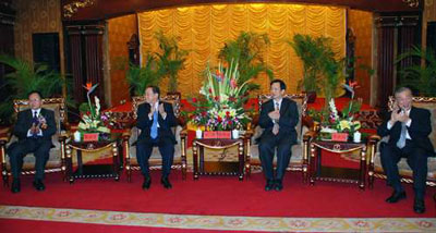 圖:泉州市委書記鄭道溪(右二)、福建省閩臺(tái)經(jīng)貿(mào)合作促進(jìn)會(huì)副主任鄒爾均(右一)會(huì)見國(guó)民黨副主席關(guān)中(左二)、全國(guó)臺(tái)企聯(lián)會(huì)會(huì)長(zhǎng)張漢文(左一)及出席“2007泉臺(tái)產(chǎn)業(yè)合作投資洽談會(huì)”的臺(tái)商代表( 來(lái)源:香港大公報(bào))