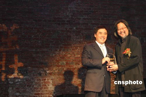 十二月七日,在臺北市著名的老劇場——紅樓劇場,第十一屆“臺北文化獎”在這里頒發。賴聲川先生創辦的“表演工作坊”以及“耕莘實驗劇團”創建人黃英雄獲得本屆大獎。圖為臺北市長郝龍斌向“表演工作坊”的賴聲川先生頒獎。 中新社發 陳國華 攝