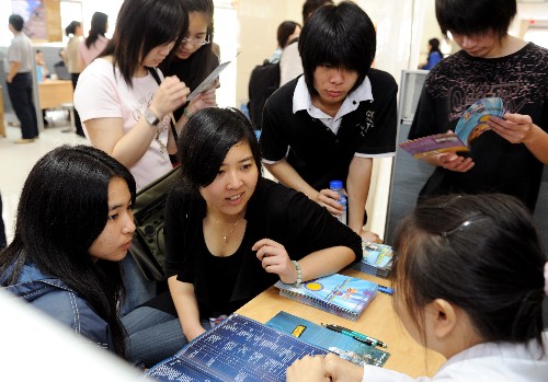 4月9日,幾名在廈門集美大學就讀的臺籍學生在就業洽談會上向招聘單位咨詢就業信息。當日,第三屆臺灣地區專業人才暨大學畢業生大陸就業洽談會在廈門市人才中心舉辦,來自大陸的80多家招聘單位提供了700多個工作崗位,吸引了200多名臺灣地區專業人才和大學畢業生前來尋求職位。 新華社記者 姜克紅 攝