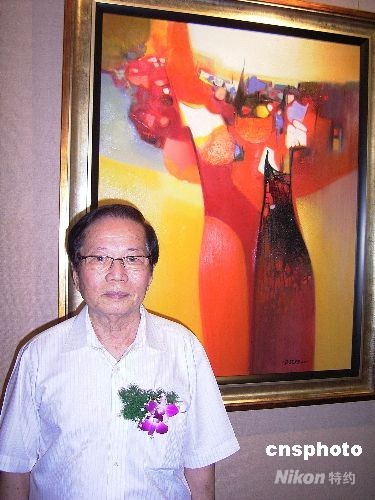 5月30日上午,瓊籍臺灣著名油畫家陳顯棟先生"八十回顧展"在海口開幕.圖為陳先生和最新創作的代表畫作合影。陳顯棟1930年生于海南,19歲赴臺,畢業于臺北復興崗學院藝術系。1961年參加“巴西圣保羅雙年展”,躋身臺灣畫家行列。兩年后“沉寂”,二十余年間,潛心研究媒材和技法,1985年以迥異于過往的畫風復出。他的畫作多表現大自然,繽紛的色彩、創新的“畫膜”材質和匠心獨具的構圖,被稱為站在東西文化交匯點上的現代油畫家,表現出“具有人性親切感的詩象境界”。 中新社發 王辛莉 攝