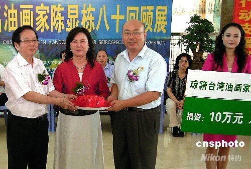 5月30日上午,瓊籍臺灣著名油畫家陳顯棟先生(左一)在椰城舉行的"八十回顧展"開幕式上,通過海南省紅十字會向四川汶川中學捐贈十萬元人民幣現金,支援災區重建。 中新社發 馬浩楠 攝