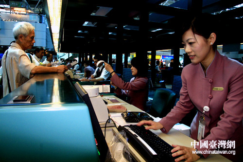 機場工作人員認真熱情地為陸客辦理登機手續(攝影:李徽)