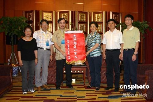7月11日下午,四川省委常委李登菊在成都錦江賓館會見了臺灣中國統一聯盟主席王津平及前任主席陳欽銘一行。此次臺灣中國統一聯盟是應四川省臺灣同胞聯誼會邀請來川,在為期4天的時間里,他們將赴雅安、都江堰等實地考察重建工作,并計劃認捐一所學校。圖為臺灣中國統一聯盟主席王津平向四川贈送一面寫著“我們都是一家人”的錦旗。 中新社發 黃永莉 攝