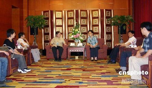 7月11日下午,四川省委常委李登菊在成都錦江賓館會見了臺灣中國統一聯盟主席王津平及前任主席陳欽銘一行。此次臺灣中國統一聯盟是應四川省臺灣同胞聯誼會邀請來川,在為期4天的時間里,他們將赴雅安、都江堰等實地考察重建工作,并計劃認捐一所學校。 中新社發 黃永莉 攝