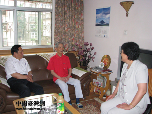 全國臺聯(lián)梁國揚會長與河南省臺聯(lián)會長郭晴看望在鄭老臺胞。(圖片來源:河南省臺辦)