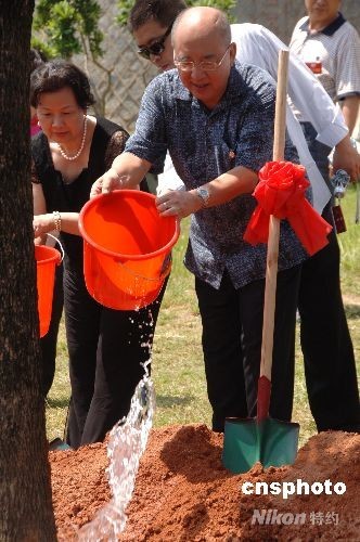 八月十四日下午,中國國民黨主席吳伯雄一行在福建永定縣高北土樓群的“土樓王”承啟樓前,植樹紀念此次祖地行。圖為吳伯雄夫婦為新種下的香樟樹澆水。 中新社發(fā) 鄭祚聲 攝