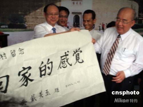 8月15日18時50分左右,中國國民黨主席吳伯雄結(jié)束赴閩謁祖之旅,乘周末包機從廈門直航返臺。圖為吳伯雄在他的家鄉(xiāng)福建永定縣下洋鎮(zhèn)思賢村展示其夫人的題詞,這正是他此行返鄉(xiāng)謁祖內(nèi)心感受的真實寫照。 中新社發(fā) 陳悅 攝