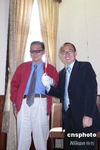臺灣知名學者李敖與大陸知名地產商潘石屹十八日在臺北舉行對談活動,吸引媒體采訪。圖為對談結束后,潘石屹贈送李敖北京奧運祥云火炬紀念品。 中新社發 曾嘉 攝