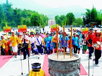 昨日中午12時,參加祭祖活動的600多名兩岸青年排著整齊的隊伍,宛如一條巨大的中華“長龍”,緩緩進入祭祀廣場。12時30分,祭祖儀式正式開始,全體祭祖人員向民族始祖炎帝神農氏深鞠三躬,虔誠致敬。在一片肅穆莊嚴的氣氛中,主祭人恭讀祭炎帝陵文:“……青春臺粵,同脈同根……海風牽襟,峽岸相望……聯心聯誼,未來共創……”字字句句,表達著海峽兩岸同根同祖,實現祖國完全統一、民族偉大復興的宏愿和決心。