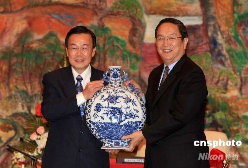 會(huì)見(jiàn)后,俞正聲向訪問(wèn)團(tuán)贈(zèng)送了清乾隆時(shí)期景德鎮(zhèn)青花扁瓶珍貴高仿品。訪問(wèn)團(tuán)則回贈(zèng)了《事事如意》金箔工藝畫(huà)和臺(tái)灣特色的鶯歌陶瓷瓶,瓶名為“和諧共贏”。