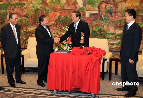 11月6日晚,中共中央政治局委員、上海市委書記俞正聲(圖右二)與市委副書記、市長韓正(右一)在上海西郊賓館會見了臺灣大企業董事長參訪團一行 該參訪團由臺達集團董事長鄭崇華、國泰世華銀行董事長汪國華、遠東集團董事長徐旭東、英業達集團董事長李詩欽等“重量級”臺商組成。會后,俞正聲與韓正向臺灣大企業董事長參訪團贈送了神舟七號飛船實體模型和神舟七號航天郵品等紀念品。 中新社發 湯彥俊 攝