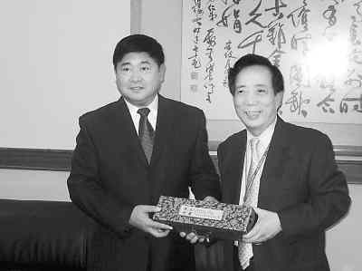 單霽翔(左)與黃光男交換禮物。姚小敏攝