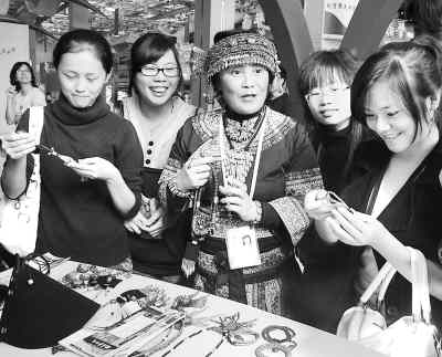圖為來自臺灣高雄市的吳秀花(中)在自己的展位上展示琉璃珠及手工藝品。