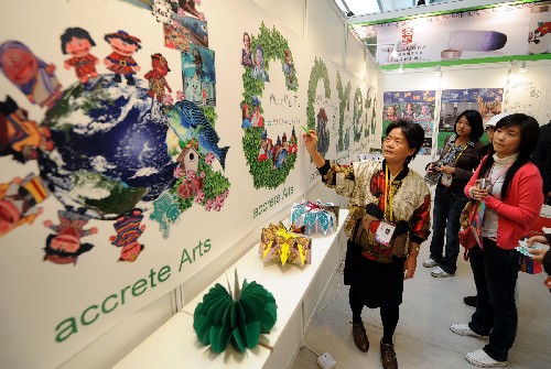 11月27日,來自臺北市山群有限公司的代表(左)在文博會上向觀眾介紹公司的創意作品。 新華社記者 姜克紅 攝