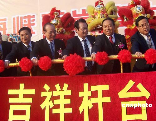 黃志光宣布“汕頭至臺灣首航啟航”,并與中國國民黨副主席林豐正,海峽兩岸航運(yùn)交流協(xié)會理事長胡漢湘等有關(guān)部門官員共同推動首航啟航桿。