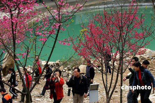 一月三十一日,臺灣櫻花綻放在福州國家森林公園櫻花園,與新建成的水體景觀碧綠湖水相映襯,吸引許多游客前來在觀賞櫻花、拍照留影。中新社發 楊婀娜 攝