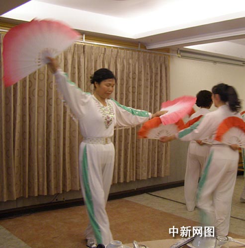 火爆臺(tái)灣熱舞后,在一陣陣江南絲竹聲中大陸老年游客手持木蘭扇翩翩起舞,雖然是在嘈雜的餐廳,照樣有板有眼,掌聲不斷。