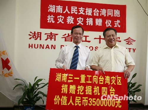 8月15日,湖南省紅十字會為受臺風重創的臺灣南部災區舉行捐贈儀式,共收到來自湖南企事業單位、長沙及湘潭市政府的捐贈款物980萬元人民幣。其中,三一重工捐贈的價值350萬元的工程機械設備成為此輪捐贈的最大一筆善款。 中新社發 肖前輝 攝