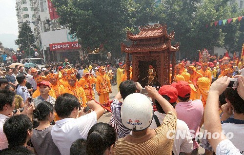 中新社順昌九月九日電 (記者 周文杰)首屆海峽兩岸齊天大圣文化旅游節九日在福建順昌縣開幕,兩岸信眾共同祭祀齊天大圣,參與兩岸齊天大圣金身踩街巡安等活動。