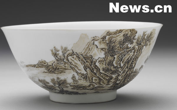 清 雍正 瓷胎畫琺瑯赭墨山水碗(圖片由臺北故宮提供)