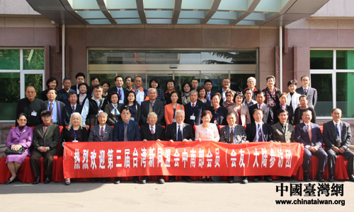 出席座談會的民革中央領導與第三屆臺灣新同盟會中南部會員大陸參訪團團員合影留念。(中國臺灣網 高斯斯 攝)