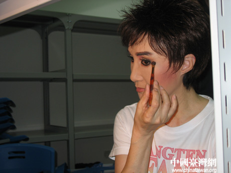 臺(tái)灣歌仔戲演員在后臺(tái)精心化妝。(中國(guó)臺(tái)灣網(wǎng) 徐麗麟 攝)