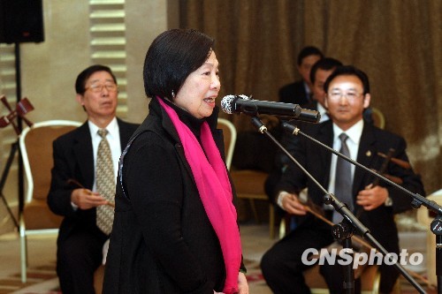 11月21日,出席海峽兩岸京劇藝術論壇的臺灣海基會前董事長辜振甫遺孀、臺灣中華婦聯總會主任委員辜嚴倬云,在天津舉行的兩岸京劇票友聯誼活動中,飽含深情地講述了自己學習京劇的過程,并現場演唱了程派代表作《鎖麟囊》選段。 中新社發 郭曉帆 攝