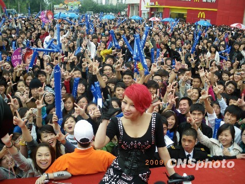 11月28日下午,亞洲流行樂壇最具人氣的性感“舞后”溫嵐“空降”福州,保留了在新專輯海報中惹眼的“紅發(fā)”造型,以一襲黑色緊身連衣短裙亮相,并獻(xiàn)上廣大歌迷最為熟悉的《屋頂》、《祝我生日快樂》等歌曲。 中新社發(fā) 張羽 攝