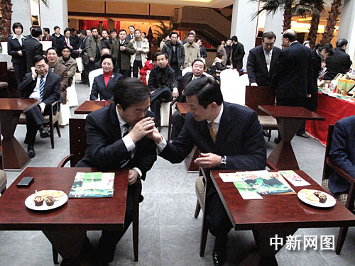 剛剛結束寧臺“雙城論壇”開幕式的臺北縣縣長周錫瑋和南京市代市長季建業品茶小憩,饒有興味地交流了彼此對茶道的理解。 申冉 攝