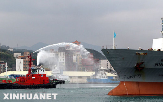 資料圖片:2008年12月15日,即將遠(yuǎn)航的船舶接受噴水祝福。當(dāng)日,臺(tái)灣萬海航運(yùn)、陽明海運(yùn)、臺(tái)灣航業(yè)、福建華榮等4家航運(yùn)公司聯(lián)合舉辦的兩岸海運(yùn)直航基隆首航儀式在臺(tái)灣基隆港舉行。新華社記者 陳斌華攝
