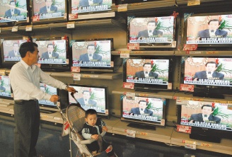 馬英九昨天親上火線舉行記者會(huì)說明ECFA,一位民眾站在電視墻前仔細(xì)觀看。來源:臺灣《聯(lián)合報(bào)》