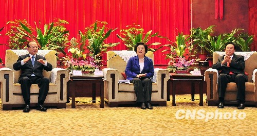 2月27日晚,全國政協副主席、臺盟中央主席林文漪(中)、海協會會長陳云林(右)等會見了臺灣國民黨副主席林豐正(左)一行。當晚,首屆海峽兩岸閩南文化節在閩南文化福建泉州開幕,臺灣國民黨副主席林豐正率臺灣代表團出席。 中新社發 張麗君 攝
