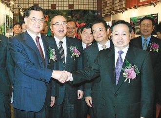 “湖北(武漢)臺灣周”開幕式暨鄂臺經(jīng)貿(mào)文化交流與合作論壇昨天揭幕,湖北省委書記羅清泉(右二)、國民黨榮譽主席連戰(zhàn)(左一)、吳伯雄(左二)及臺灣工總理事長陳武雄(右三)、遠東集團董事長徐旭東(右四)等企業(yè)界領(lǐng)袖參與活動。圖片來源:臺灣《經(jīng)濟日報》