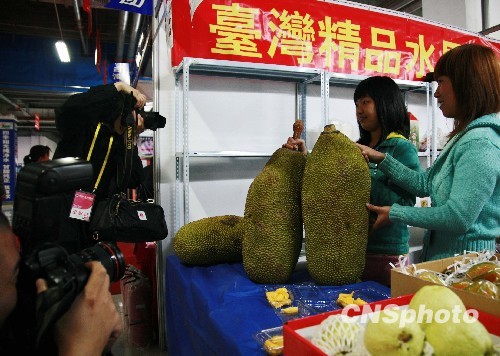 4月26日,在河北正定縣小商品博覽會上,300個家臺企的數(shù)千種商品亮相。在臺灣展區(qū)展銷的水果、小食品、飾品、服裝等特色商品受到游人歡迎。圖為來自寶島臺灣的精品水果“菠蘿蜜”其碩大的體形吸引了媒體的眼球。 中新社發(fā) 翟羽佳 攝
