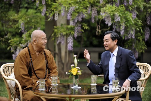 5月14日,國臺辦主任王毅邀請臺灣星云法師在北京釣魚臺國賓館的草坪上茶敘。 中新社發(fā) 廖攀 攝