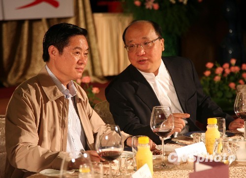 25日晚,臺中市市長胡志強會見并宴請了正在此間參加“天府四川寶島行”的中共四川省委書記劉奇葆一行。胡志強期待大熊貓也能落戶臺中,目前四川與臺中還沒有直飛的航線,臺中方面正在積極努力爭取,希望明年臺中能直飛四川。圖為劉奇葆與胡志強在宴會上交談。 中新社發 鄒輝 攝