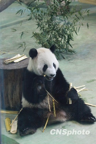 來臺1年有余、被眾觀者贊譽為“超可愛”的大熊貓團團圓圓正在臺北木柵動物園的新光熊貓館過著和美的生活。臨近25日傍晚時分,工作人員說已開始有發情跡象的圓圓常愛不停走動,幾乎沒有片刻停歇,她一會在水里沖涼,一會在地上打滾,一會又爬樹來一個驚險倒立,引得觀者一陣陣叫好。圖為在隔壁和她分居的團團卻年少不諳性事,只顧自地大快朵頤大嚼竹子,全然不理不睬圓圓,令人忍俊不禁。 中新社發 閆曉虹 攝