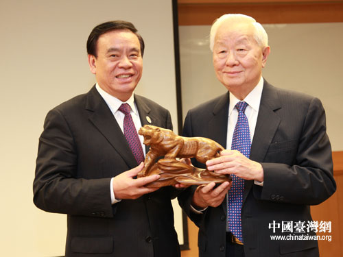 呂祖善贈送東陽老虎木雕給臺積電董事長張忠謀。(浙江省臺辦 王健 攝)